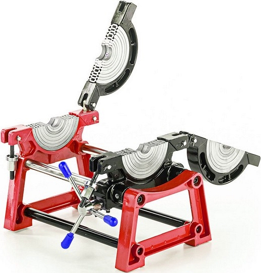 - Центратор с 2-мя откидными зажимами и фиксатором имеет большой запас прочности за счет качественного сплава и ребер жесткости, что позволяет сваривать полимерные трубы с любым показателем SDR