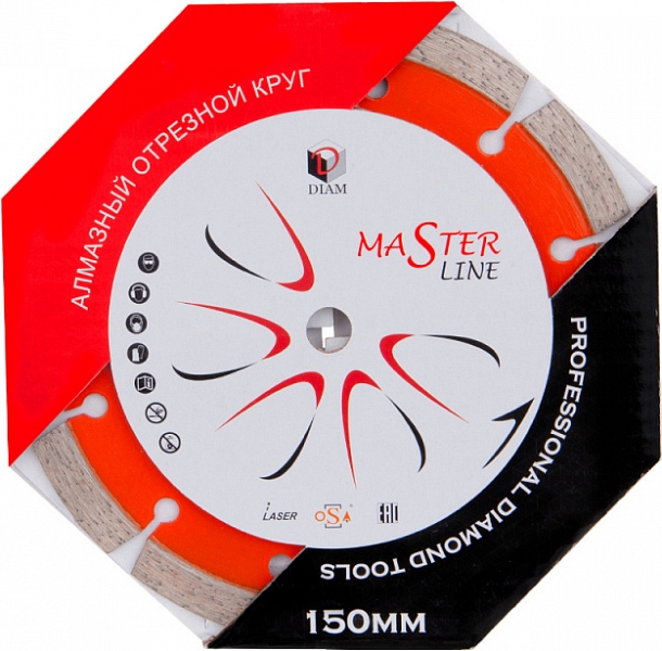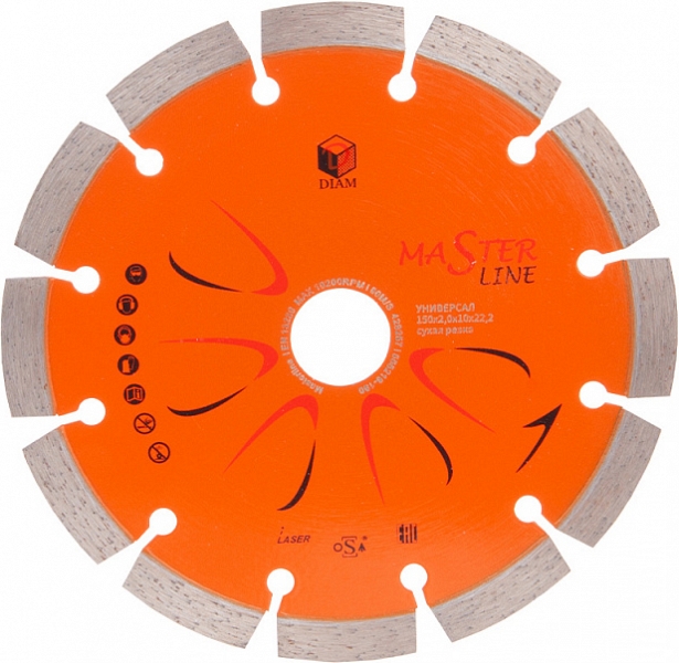 Сегментный алмазный круг Diam Master Line 1A1RSS Универсал 150 мм (Диам Мастер Лайн 1А1РСС Универсал 150 мм) – специальный алмазный отрезной диск с лазерной сваркой сегментов для сухой и мокрой резки бетона, тротуарной плитки, кирпича, черепицы, песчаника, природного и искусственного камня, строительных материалов общего назначения на углошлифовальных машинах (ушм, болгарках), штроборезах, с подачей и без подачи воды.